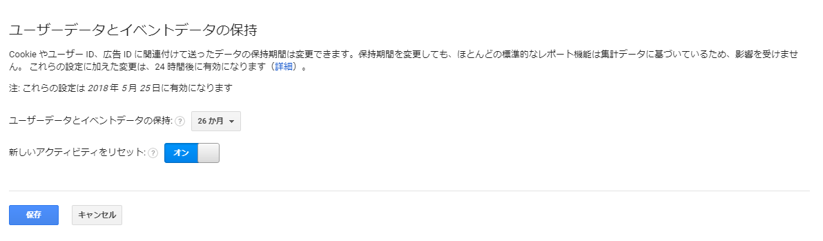 従来、GoogleAnalysticsはデータを無期限に持っていましたが、今回の一般データ保護規則(GDPR)の件を受けて、データ保持ルールを変更しました。