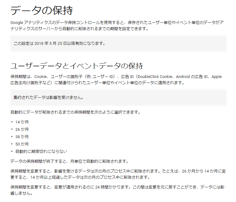 - 5/25日以降、GoogleAnalysticsのデータ保持ルールが変わります。ユーザーデータとイベントデータの保持(後述)を一定期間だけ保持します。