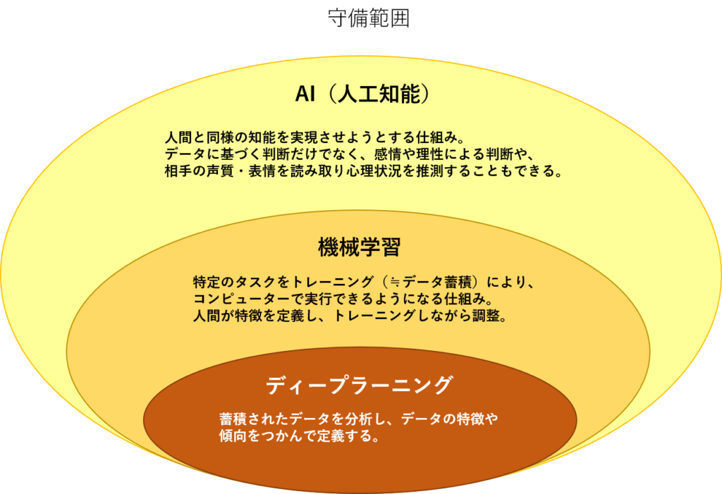 ここまで、AI(人工知能)、機械学習、ディープラーニングについて、それぞれどのような技術なのか?を簡単に解説しました。
