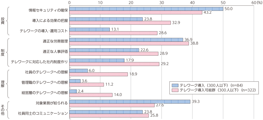 セキュリティに関する課題は、技術的にクリアするのが難しいため、結果としてテレワークの導入の大きな障壁になっている可能性があります。